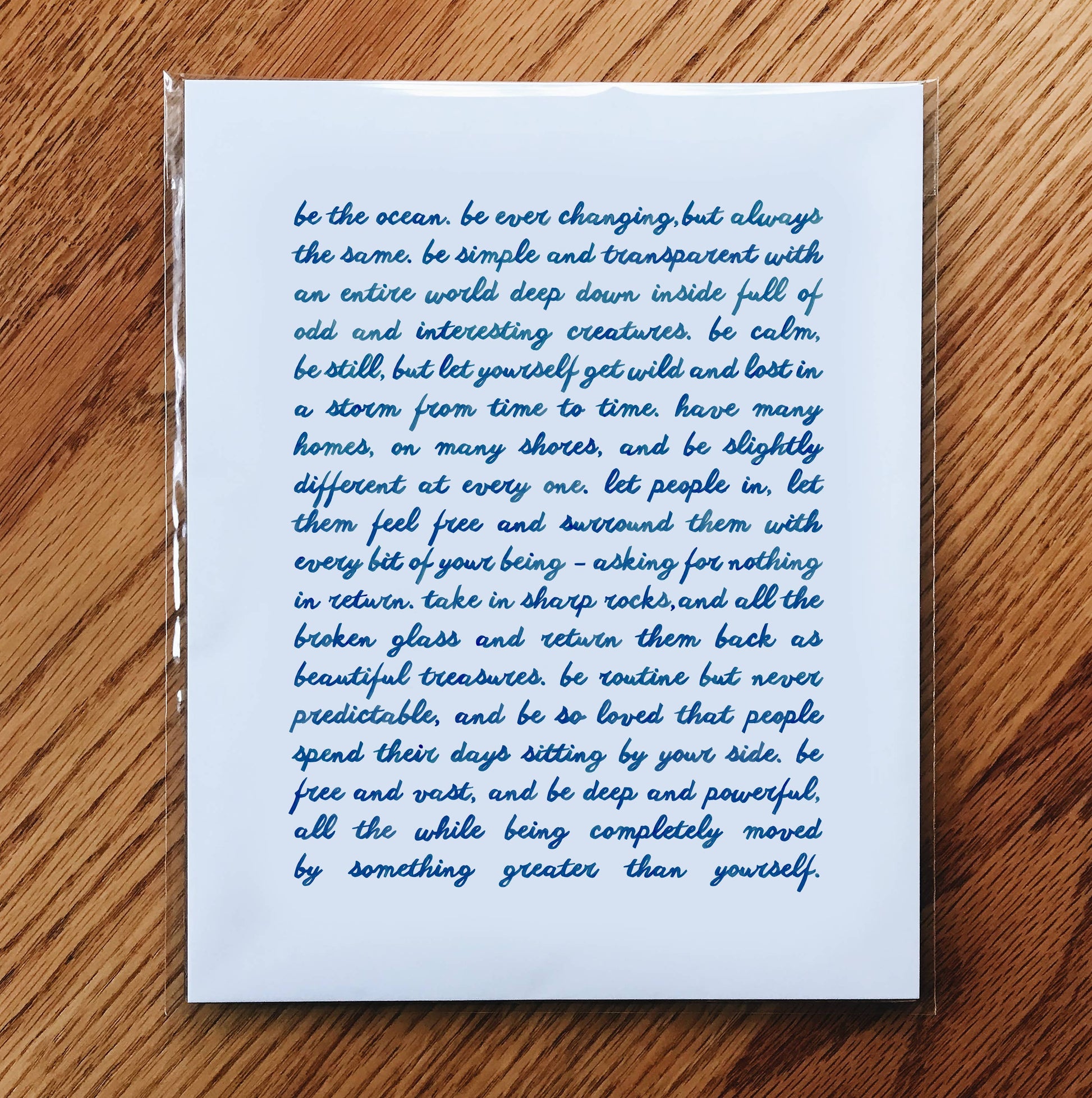 This original sea-themed poem has been hand-watercolored, scanned, digitally cleaned and printed on archival-quality luster photo paper. Packaged in a plant-based sleeve with corrugated cardboard.